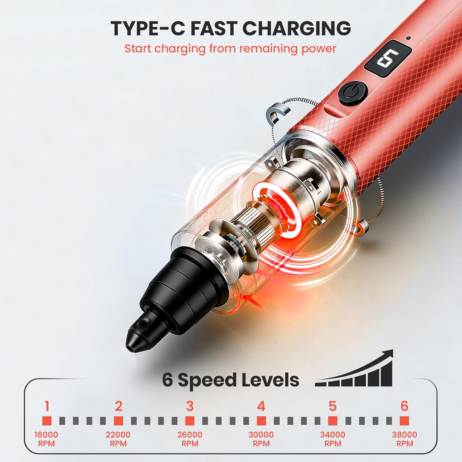 【Precision Control】 Cordless rotary tool offers 6 variable speeds (18,000-38,000 RPM) for greater creative flexibility. Easily handle a variety of precision tasks and material types, allowing you to unleash your creative potential.